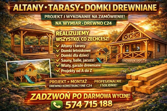 ALTANY • TARASY • DOMKI DREWNIANE – NA WYMIAR C24 Szukasz solidnej altany, tarasu lub domku drewnianego? Zajmujemy ...