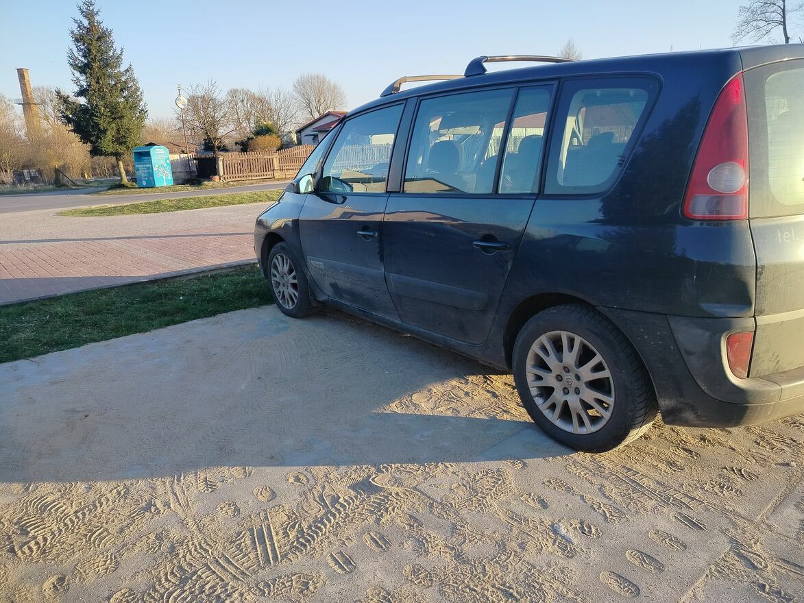 Witam. Sprzedam Renault Espace z silnikiem 1.9 dCi 120km. Auto słuzy mi już półtora roku i śmiga dalej. Auto ma pozostałości po naklejkach które już na lakierze zostaną. Autem jeździłem z całą rodziną oleje filtry wymieniane na bieżąco OC aktualne przegląd do października.Z wymienionych rzeczy-Koło pasowe+rolki+napinacz