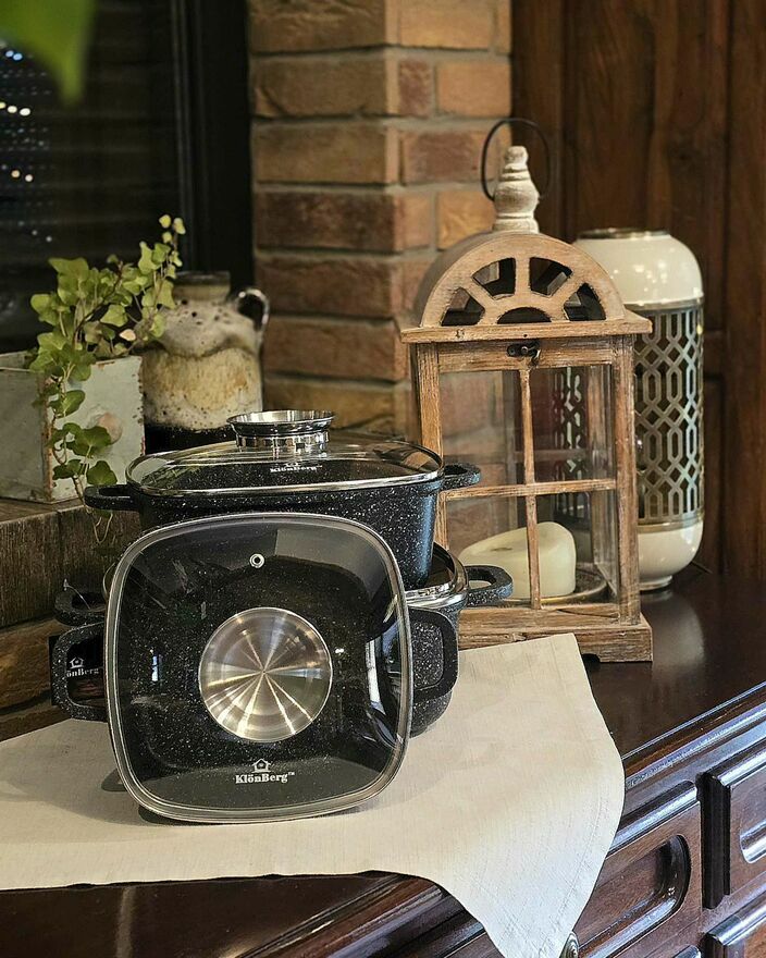 ZESTAW 3 BRYTFANN GARNKÓW 2,5 / 4,5 / 6.5L ZILNER ZL-7019Komplet 3 garnków kwadratowych (brytfann) EDEL HOFF / ZILNER pokrytych marmurową ceramiczną powłoką nieprzywierającą. Zestaw posiada pokrywki szklane z uchwytem Aroma Knob w którym umieszczono dozownik oleju, dzięki któremu podczas gotowania lub duszenia można podawać olej lub płynne przyprawy. Garnki wykonane ze stopu aluminium posiadają indukcyjne ferromagnetyczne dno. Przystosowane do współpracy z każdym rodzajem kuchni, włącznie z indukcyjną.