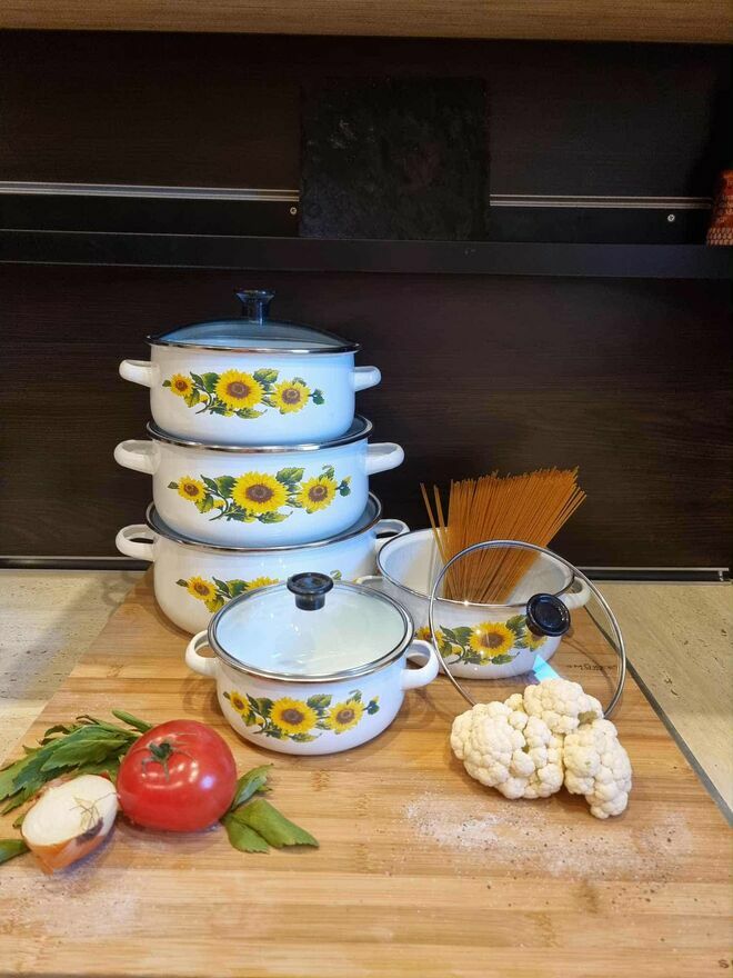 Garnki emaliowane kremowe kwiaty , truskawki , słoneczniki ,