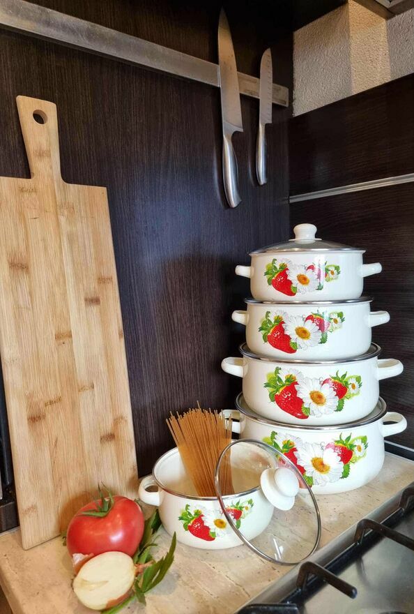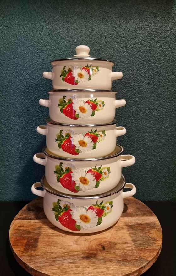 Zestaw składa się z 5 garnków z pokrywkami do stosowania na gazie + indukcji. Wykonane są ze stali emaliowanej wysokiej jakości.