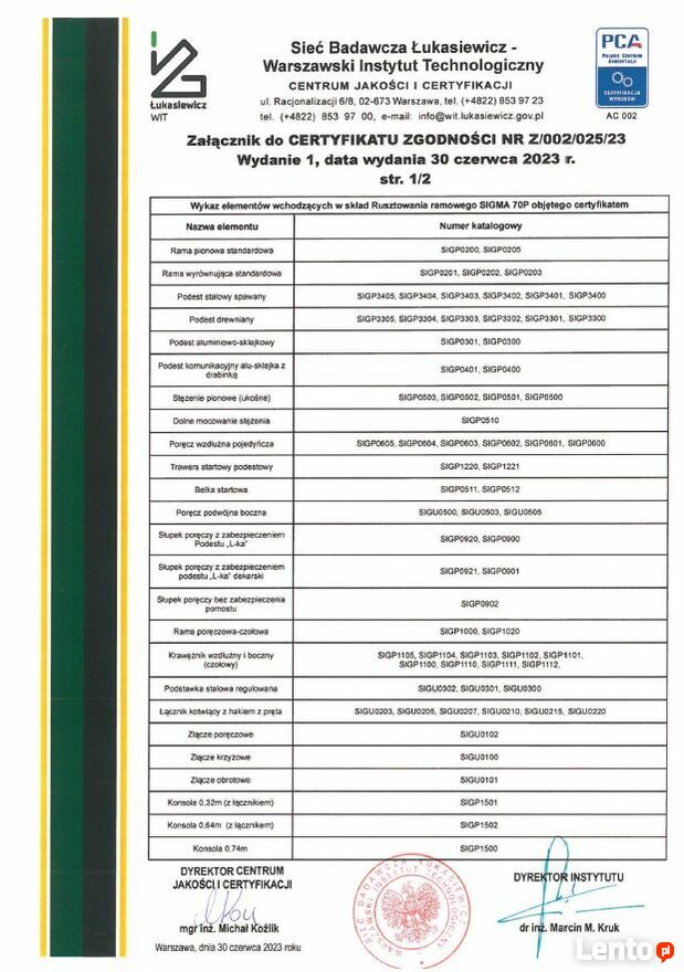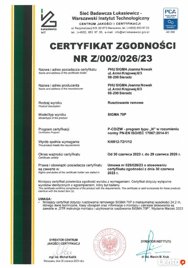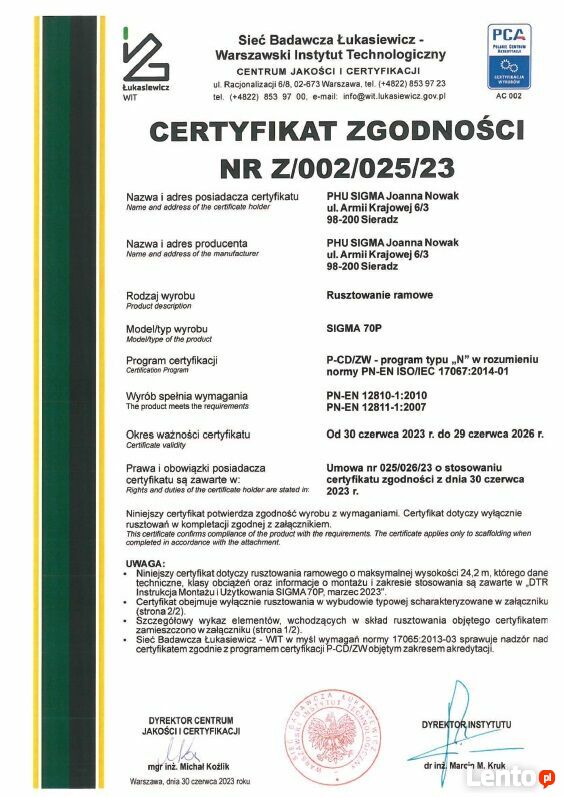 Rusztowania SIGMA 70P są produkowane zgodnie z normami stosowanymi w Unii Europejskiej.