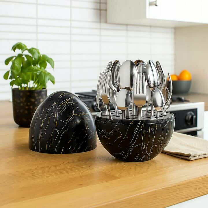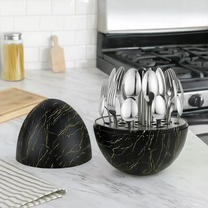 Wszystko zapakowane w elegancki, designerski stojak w kształcie kwiatowego pucharu, który nie tylko pięknie wygląda, ale i pozwala utrzymać porządek w kuchni.