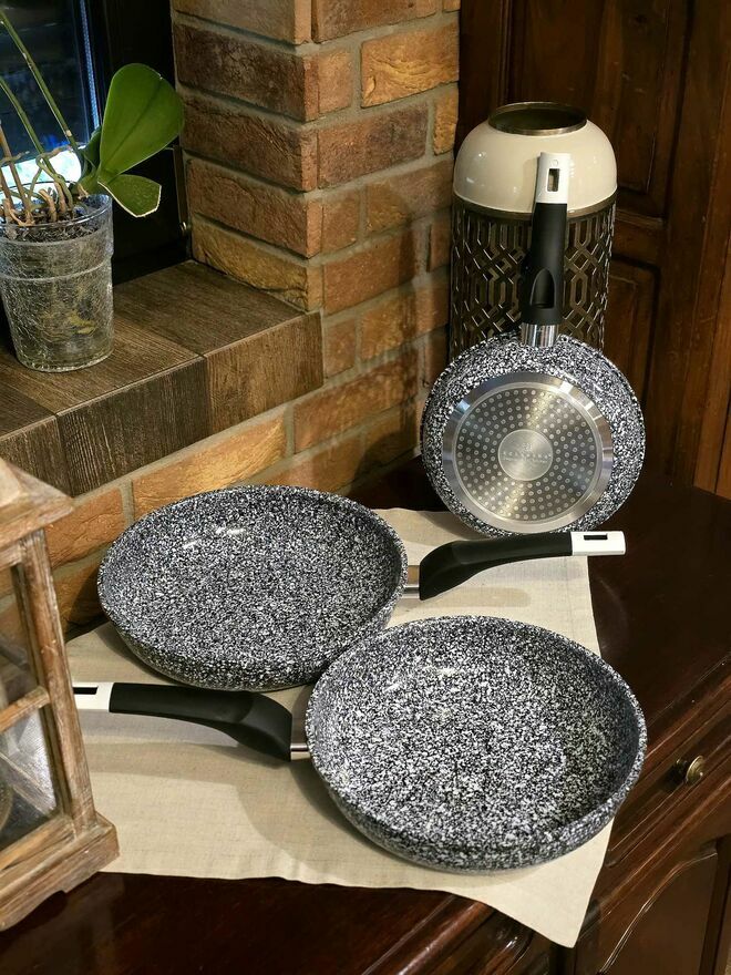 Patelnie aluminiowe z powłoką marmurową pozwalają na bezpieczne przyrządzanie chrupiących, aromatycznych i zdrowych potraw.