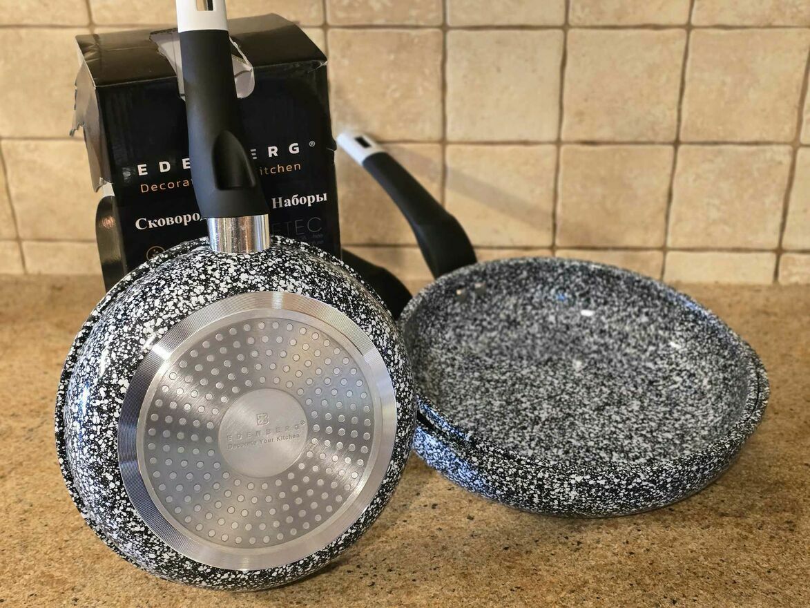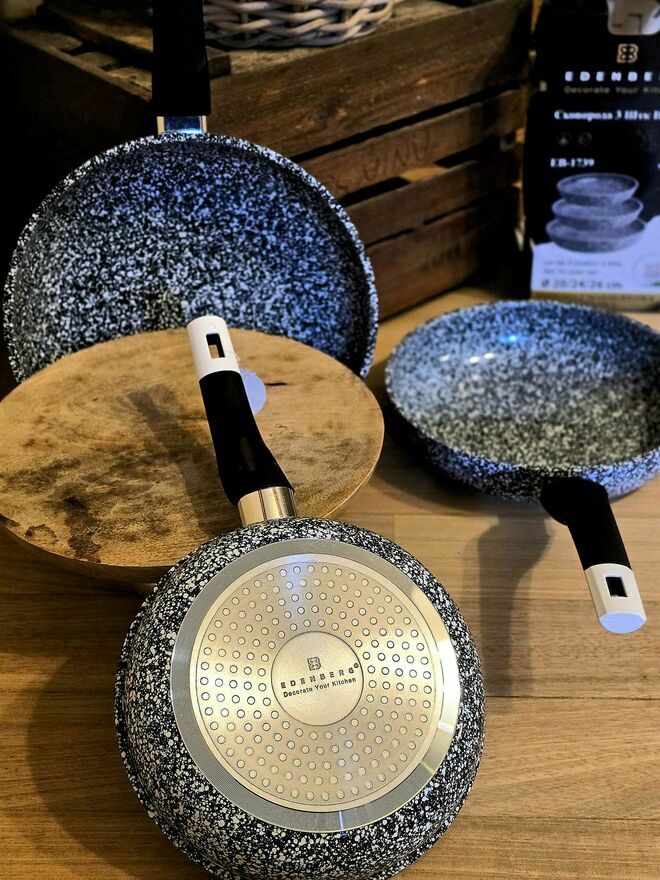 W ofercie KOMPLET PATELNI Marmurowych 3 szt. 20/24/26cm EDENBERG EB-1739.Zestaw trzech patelni z powłoką marmurową.