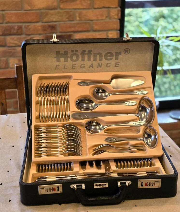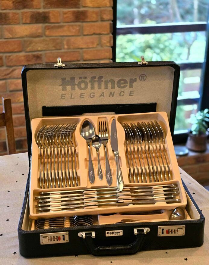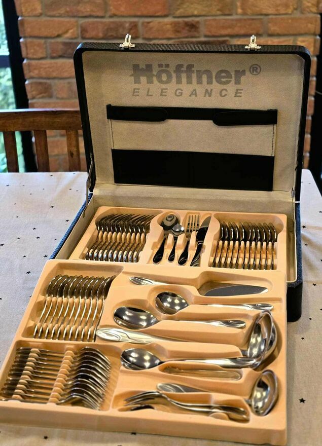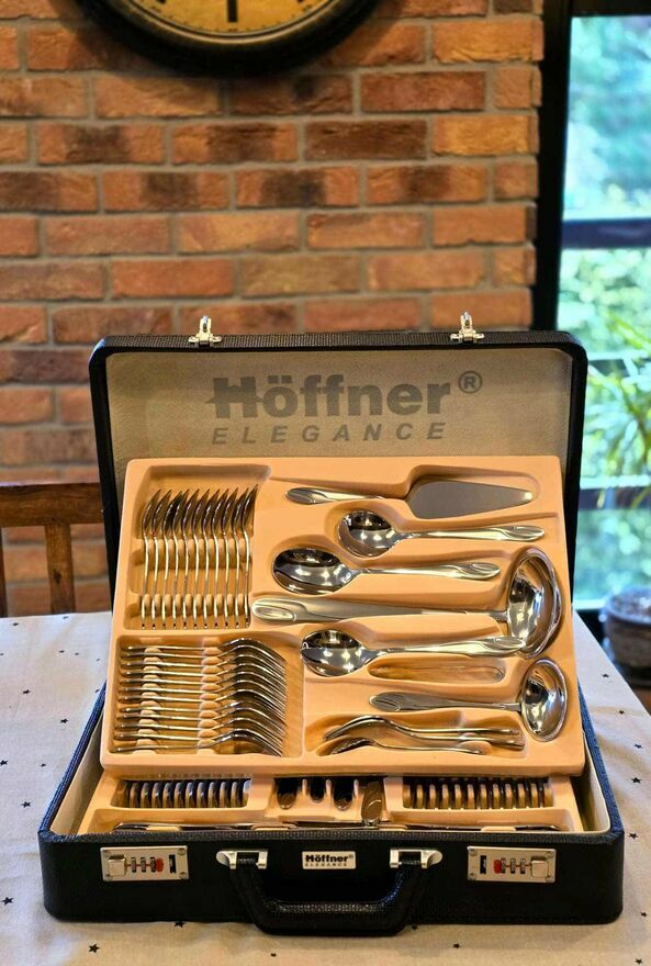 Zestaw Sztućców Hoffner Elegance 72 el. POŁYSK Komplet W WalizceSztućce Hoffner Elegance w walizce to elegancki zestaw składający się z 72 elementów, przeznaczony dla 12 osób. Wykonane z wysokiej jakości stali nierdzewnej 18/10, polerowane na wysoki połysk, zapewniają trwałość i estetyczny wygląd. Zestaw jest idealnym rozwiązaniem na większe spotkania rodzinne, przyjęcia czy jako prezent ślubny.